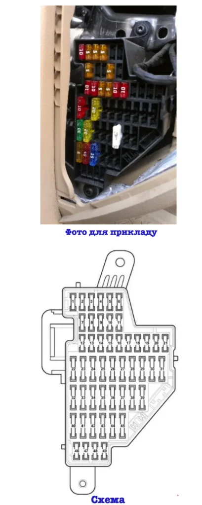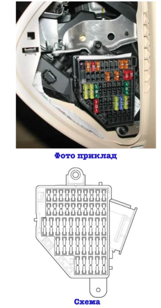 - Блок запобіжників панелі приладів з боку водія