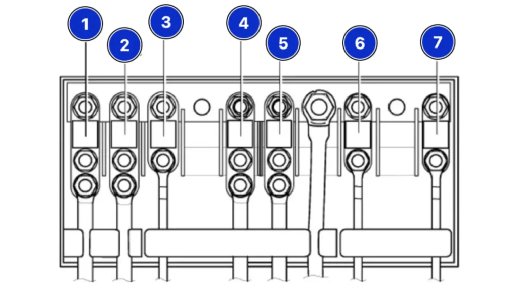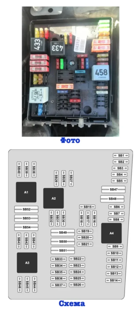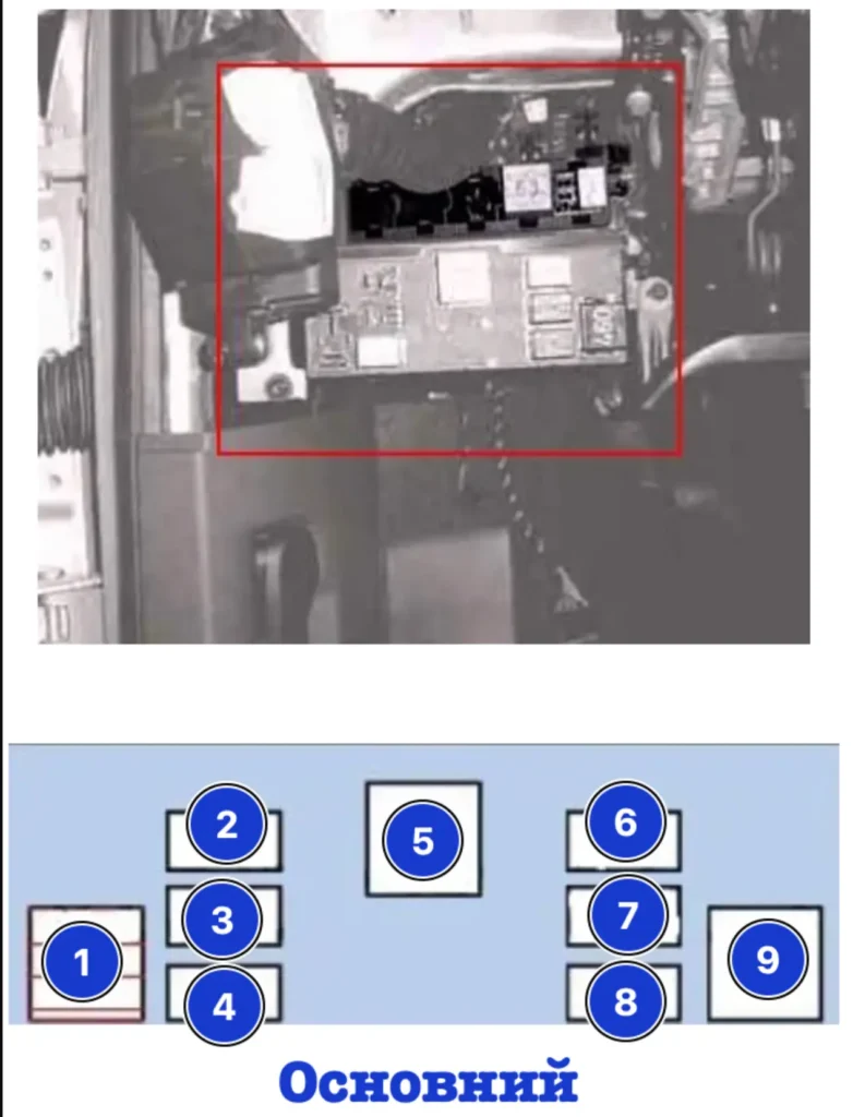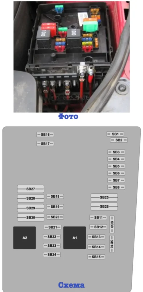 Він розташований поруч з акумуляторною батареєю і закритий захисною кришкою. Складається з двох блоків. 1 – Відділ запобіжників високої потужності у вигляді плавких вставок. 2 – відділ запобіжників і реле.
